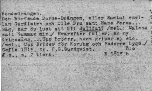 //// Bond•drängen. //// Den Wärf*a4« .fonde-Drängen, eller Samtal eciel-lan Sardiaten och Clle Bro wuttt Kana Peraa... S&t*, har du lust att ti i 3olldat? /mel.: Malena »ali tumman min./ HwarefterföYjer; In ny Srirtsaång, .. .Upp Bröder, htfem griper ej etc. /mel.; Upp Breder för Konung och Fäderne tygd./ Ge fl» lBl<?, tr. r.Cr.Sundqwist. 3: o //// £ s., s. ? hlank. K i5l< b ////