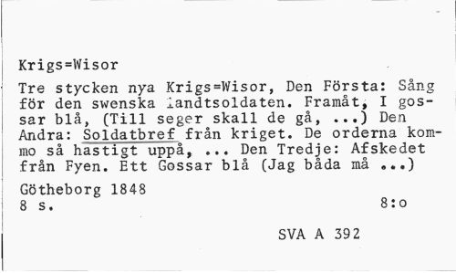 //// Krigs=Wisor //// Tre stycken nya Krigs=Wisor, Den Första: Sång för den swenska landtsoldaten. Framåt, I gossar blå, (Till seger skall de gå, ...) Den Andra: Soldatbref från kriget. De orderna kom-mo så hastigt uppå, ... Den Tredje: Afskedet från Fyen. Ett Gossar blå (Jag båda må „..) //// Götheborg 1848 //// 8 s. 8:0 //// SVA A 39 2 ////