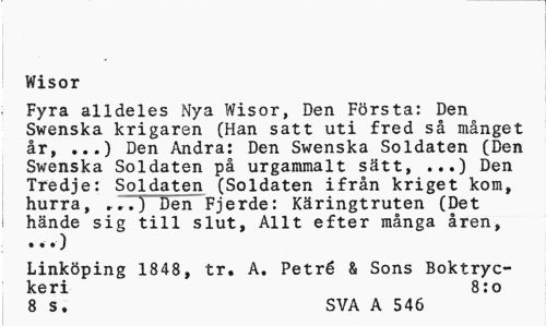 //// Wisor //// Fyra alldeles Nya Wisor, Den Första: Den Swenska krigaren (Han satt uti fred så månget år, ...) Den Andra: Den Swenska Soldaten (Den Swenska Soldaten på urgammalt sätt, ...) Den Tredje: Soldaten (Soldaten ifrån kriget kom, hurra, .».) Den Fjerde: Käringtruten (Det hände sig till slut, Allt efter många åren, //// Linköping 1848, tr. A. Petré & Sons Boktryckeri 8:0 8 S. SVA A 546 ////