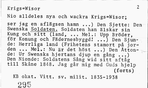 //// 2 //// Krigs=Wisor //// Nio alldeles nya och wackra Krigs=Wisor; //// ser jag en aflägsen hamn Den Sjette: Den //// Swenska Soldaten^ Soldaten han älskar sin Kung och sitt (land, ... Mel.: Upp Bröder, för Konung och Fädernesbyggd.' ...) Den Sjunde: Herrliga land (Frihetens stamort på jorden ... Mel.: Nu är det höst ...) Den Åtton- ... de: Ur Swenska hjertans djup en gång ...) Den Nionde: Soldatens Sång wid sitt aftåg till Skåne 1848. Jag går mig med Guds hjelp //// (forts) //// KB okat. Vitt. sv. milit. 1835-1938 9 Q ////