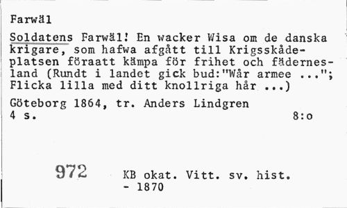 //// Farwäl //// Soldatens Farwäl i En wacker Wisa ont de danska krigare, som hafwa afgått till Krigsskådeplatsen föraatt kämpa för frihet och fädernesland (Rundt i landet gick bud:"Wår armee Flicka lilla med ditt knollriga hår ...) //// Göteborg 1864, tr. Anders Lindgren 4 s. 8:0 //// 972 KB okat. Vitt. sv. hist. //// - 1870 ////