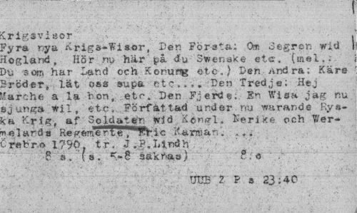 //// I //// Crigsviaor . //// Pyra nya K.riga»Wisor, Pen Första: Om oegren wid I logland, Hör nu här'på du Svenske etc. '('mel,. >u aofii har Latid och Konung etc.) Sen Andra; Kärs Breder, lät oss supa etc... Den Tredje; Hej Jarehe a la bon, etr. Den F,jerd«j; En Wisa jag nu sjunga etc, Författad under, nu warande FSys- //// ca Krig, af Soldaten wid Kongl. Keriice och Wer-n.alards Re ni""11' i c itarman, ...,» 5r«b r,o 1790. tr, J.P.Lindh, //// 8 a . " (s . aäkfa.s) f . o . //// UHE z P s 23;4C ////