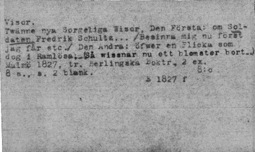 //// - , ... //// Visor, //// Twänr.e ny* Sorsrellga Wisor, Den Först*: o® Sol-dator;, fred rik SchultÄ,.. /Besir.r* wi:.- nu fcrffl :jag får etc./ Den Andr»:- öfwer en Flicka som. dog i Hamlösa^Oa wisenar nu ett blomster bort. ; MuIbSj 1827, tr, -Berlingska Boktr, 2 ex. ! 8 a. f •. 2 blank . 8:0 //// 'A 1827 f - //// t • : ¦. ¦ ... . . • o . ¦¦• •: ... -- ; ." ' . • • / ' „ //// I f -T ¦' ¦ i * * ' \ t" J ; " f ' ^ ' **» ////
