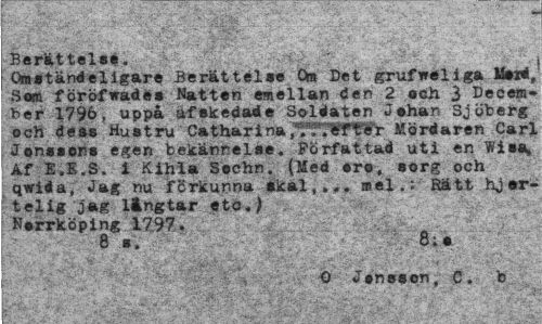 //// Berättelse. '-v ~ //// Qmständeligare Berättelse Ort Det grufneliga V»xé Som föröfwades Natten emellan den 2 och 3 Decem^ ber 1796, uppå äf skedade Soldaten Johan Sjöberg och de as Hustru Catharina iTfSWWV Mördaren Car] Jonssons egen bekännelse. Författad uti en Wisa Af E.E.S. 1 Kihla Sechn. (Med sr©, sorg och q wid a, Jag nu förkunna skal,... mel.: Rätt hj ar-telig jag Ungtar etc.) , Norrköping 1797. //// 8 s. 8 i • //// ¦ . - ¦ »> ... j - i ' : : ' < ' < //// o Jsnsson, C. b ////