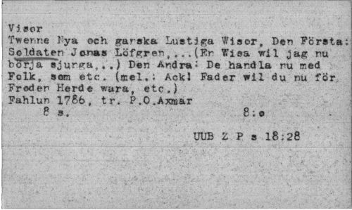 //// Visor //// Twenne Dya och ganska Lustiga Wisor, Den Första: Soldaten Jo-nas Löfgren, .. „ (Én Wiea vril jag nu borjå »oure;a,, .) Den Andra: De handla nu med Folk, som etc. (mel.; Ackl Fader wil du nu för Fr oden Herde wura, etc.) Fahlun 17&6» tr. P.O.Axraar //// B s. 8; o //// UUB Z P s 18;28 //// . ¦¦¦¦ V: ¦ ' : '.-','¦¦ ' ¦ - ' ¦¦' •-* ////
