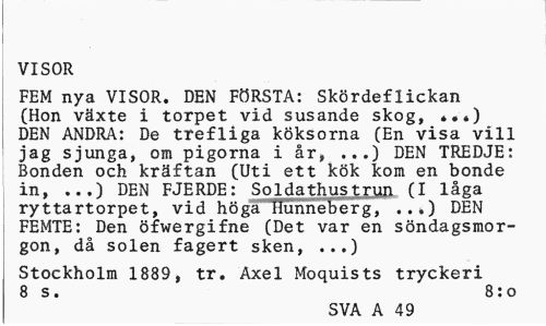 //// VISOR //// FEM nya VISOR. DEN FÖRSTA: Skördeflickan (Hon växte i torpet vid susande skog, ...) DEN ANDRA: De trefliga köksorna (En visa vill jag sjunga, om pigorna i år, ...) DEN TREDJE: Bonden och kräftan (Uti ett kök kom en bonde in, ...) DEN FJERDE: Soldathustrun (I låga ryttartorpet, vid höga Hunneberg, ...) DEN FEMTE: Den öfwergifne (Det var en söndagsmorgon, då solen fagert sken, ...) //// Stockholm 1889, tr. Axel Moquists tryckeri 8 s. 8:0 //// SVA A 49 ////