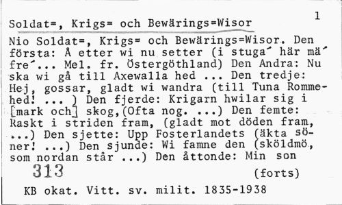 //// Soldat=, Krigs= och Bewärings=Wisor //// Nio Soldat=, Krigs- och Bewärings=Wisor. Den första: A etter wi nu setter (i stuga" här mä" fre"... Mel. fr. Östergöthland) Den Andra: Nu ska wi gå till Axewalla hed ... Den tredje: Hej, gossar, gladt wi wandra (till Tuna Romme-hedl ... ) Den fjerde: Krigarn hwilar sig i [mark ochj skog,(Ofta nog. ...) Den femte: Raskt i striden fram, (gladt mot döden fram., ...) Den sjette: Upp Fosterlandets (äkta söner.' ...) Den sjunde: Wi famne den (sköldmö., som nordan står ...) Den åttonde: Min son //// 313 (forts) //// KB okat. Vitt. sv. milit. 1835-1938 ////