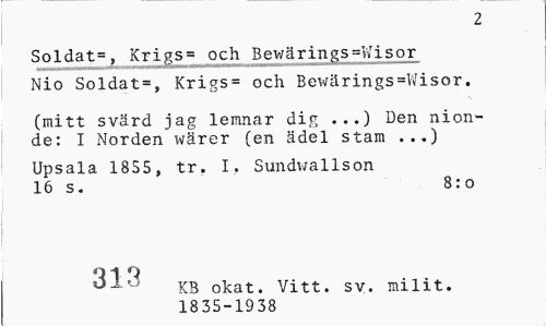 //// 2 //// Soldat=, Krigs* och Bewärings=Wisor //// _|_iiiljjjjuiljixiu^ "... //// Nio Soldat», Krigs= och Bewärings=Wisor. //// (mitt svärd jag lemnar dig ...) Den nionde: I Norden wärer (en ädel stam . ..) //// Upsala 1855, tr. I. Sundwallson //// 16 s. 8:o //// 313 KB okat> Vitt. sv. milit. 1835-1938 ////