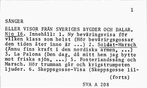 //// 1 //// SÅNGER //// ELLER VISOR FRÄN SVERIGES BYGDER OCH DALAR. N;o 16. Innehåll: 1. Ny beväringsvisa för vilken klass som helst (Hör bevärirgsgossar den tiden åter inne är ...) 2. Soldat-Marsch (Ännu fins kraft i den nordiska armen, ...7" 3. La Paloma (Den dag, då mitt hem jag bytte mot friska sjön, ...) 5. Fosterlandssang och Marsch. Hör trumman går och krigs trumpeten ljuder. 6. Skeppsgosse-Visa (Skeppsgosse lil- //// (forts) //// SVA A 20 8 ////