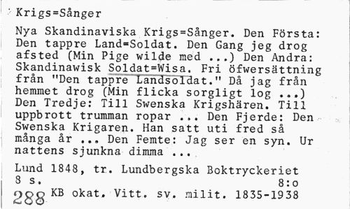 //// ' Krigs=Sånger //// Nya Skandinaviska Krigs=Sånger. Den Första: Den tappre Land=Soldat. Den Gang jeg drog afsted (Min Pige wilde med ...) Den Andra: Skandinawisk Soldat=Wisa. Fri öfwersättning från "Den tappre Landsoldat." Då jag från hemmet drog (Min flicka sorgligt log ...) Den Tredje: Till Swenska Krigshären. Till uppbrott trumman ropar ... Den Fjerde: Den Swenska Krigaren. Han satt uti fred så många år ... Den Femte: Jag ser en syn. Ur nattens sjunkna dimma ... //// Lund 1848, tr. Lundbergska Boktryckeriet 8 s.. 8:0 //// poo KB okat. Vitt. sv. milit. 1835-1938 ////