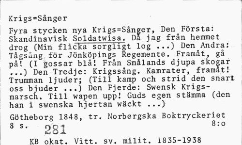 //// Krigs=Sånger //// Fyra stycken nya Krigs=Sånger, Den Första: Skandinavisk Soldatwisa_. Da jag från hemmet drog (Min flicka sorgligt log ...) Den Andra: Tågsång för Jönköpings Regemente. Framåt, gå på t (I gossar blål Från Smålands djupa skogar ...) Den Tredje: Krigssång. Kamrater, framatl Trumman ljuder; (Till kamp och strid den snart oss bjuder ...) Den Fjerde: Swensk Krigsmarsch. Till wapen upp] Guds egen stämma (den han i swenska hjertan wäckt ...) //// Götheborg 1848, tr. Norbergska Boktryckeriet //// s s. 2S1 8:0 //// rR nVat Vi cir mi 1 i t IR^^-IQ^» ////