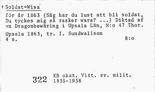 //// » Soldat=Wisa //// för år 1863 (Säg har du lust att bli soldat, Du tyckes mig så rasker wara? .,.) Diktad af en Dragonbewäring i Upsala Län, N:o 47 Thor, //// Upsala 1863, tr. I. Sundwallson 4 s. 8:o //// noo KB °kat. Vitt. sv. milit. 1835-1938 ////