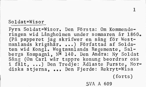 //// 2 //// Soldat=Wisor //// Fyra Soldat=Wisor. Den Första: Om Kommende-ringen wid Långholmen under sommaren år 1860» (På papperet jag skrifwer en sång för West-manlands krigshär. ...) Författad af Soldaten wid Kongl. Westmanlands Regemente, Salbergs Kompagni, N- 140. Den Andra: Ny Soldat Sång (Om Carl wår tappre konung beordrar oss i fält, ...) Den Tredje: Ädlaste Furste, Nordiska stjerna, ... Den Fjerde: Rekryt=Wisa //// (forts) //// SVA A 609 ////