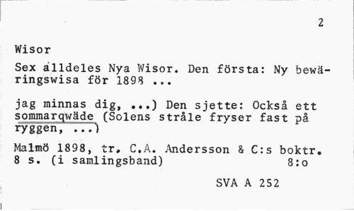 //// 2 //// Wisor //// Sex alldeles Nya Wisor. Den första: Ny bewä-ringswisa för 1898 ... //// jag minnas dig, ...) Den sjette: Också ett sommarqwäde (Solens stråle fryser fast på ryggen, 7771 //// Malmö 1898, tr, C.A. Andersson & C:s boktr. 8 s. (i samlingsband) 8:o //// SVA A 252 ////