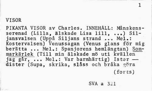 //// 1 //// VISOR //// PIKANTA VISOR av Charles. INNEHÅLL: Månskensserenad (Lilla, älskade Lisa lill, ...) Siljansvalsen (Uppå Siljans strand ... Mel.: Kostervalsen) Venussagan. (Venus glans för mig berätta ... Mel.: Spanjorens hemlängtan) Sommarkärlek (Till min älskade mö uti kvällen jag går, ... Mel.: Var barmhärtig) Is ter — dister (Supa, skrika, slåss och bråka göra //// (forts) SVA a 3<:1 ////