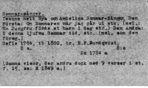 //// Sommar-»ånger. //// Twenne heft Ifyä och And el i ga 3oram»r-Sån^r; Den första: Ön Sommaren när jas: g&r ut etc. (mel.: En Jungfru födde et barn t dag etc.) Den Andra: I denna ljufwa Sommar tid, etc. (mel. »om den föreg.) //// Gefle 1784, ib 1802, tr, E.P.Sundqwist. //// e s. 8:0 //// Z* 1784 a //// (Samma visor, den andra dock med 9 verser i st, f. 15, se: K 1849 a.) ////