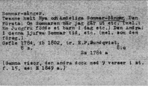 //// Sommar-sånger. ¦ K--- • //// Twenne helt Nya odh Andeliga 3atm*r~3knmr, Den //// Första: Q» Sommaren r»är jag gfcr ut etc. Tmel.: //// En Jungfru födde et barn I dag etc.) Den Ändra.: //// I denna ^Jufwa- 3owmar- tid , etc. (mel, som den //// föreg.)< //// Gefle 1784, ib 1802, tr. E.P.frundqwist. //// 8 s. 8;o //// Za 1784 a //// (Samnia risor, den andra dock med 9 verser i st. f. 15, se; S 1849 a.) ////