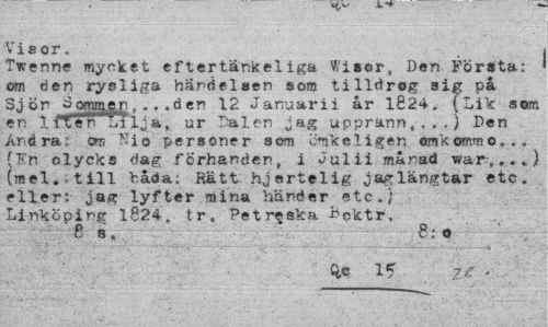 //// Visor. //// Twenne mycket eftertänkeliga Wisor, Den Första: om den rysliga händelsen som tilldrog sig på Sj ön S ögasen ,,,,den 12 Januarii år 1824. (Lik som en 1 rxén Lilja, ur Dalen jag upprann, , . . j Den Andra: om Nio personer som onkel igen omkommo... (En olycks dag förhanden, i Julii månad war,,..) (mel.; till båda: Rätt hjertelig j^ag längtar etc. eller: jag lyfter mina händer etc.) Linköping 1824, tr, Fet re ska i^oktr, //// e B, 8:9 //// Ctc 15 u - ////