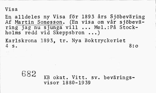 //// Visa //// En alldeles ny Visa för 1893 års Sjöbeväring Af Martin Sonesson. (En visa om vår sjöbeväring jag nu sjunga vill ... Mel.:På Stockholms redd vid Skeppsbron ...) //// Karlskrona 189 3, tr. Nya Boktryckeriet 4 s. 8:o //// f» Qp //// KB okat. Vitt. sv. bevärings-visor 1880-1939 ////