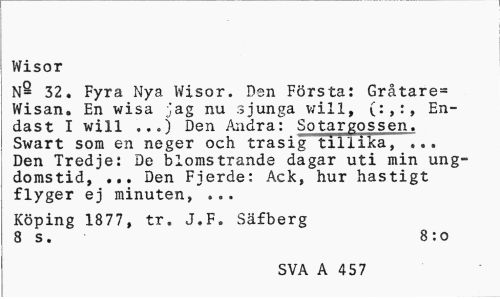 //// Wisor //// N§ 32. Fyra Nya. Wisor. Den Första: Gråtare= Wisan. En wisa jag nu sjunga v/ill, (:,:, Endast I will ...) Den Andra: Sotargossen. Swart som en neger och trasig tillika, ... Den Tredje: De blomstrande dagar uti min ungdomstid, ... Den Fierde: Ack, hur hastigt flyger ej minuten, ... //// Köping 1877, tr. J.F. Säfberg 8 s. 8 :o //// SVA A 457 ////