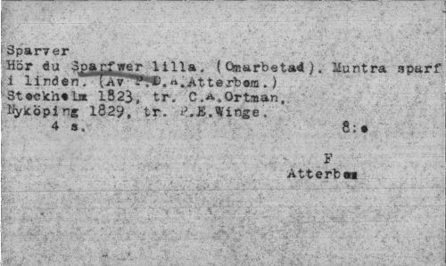 //// 3parver //// Hör du opatfwer lilla. (Qnarbetad). Muntra sparf //// i lind«n . ™v i"'!*1. <*.Åtterb«m . ) '3t«clch«l» 1823, tr. C .a sOrtman, %köping 1829, tr. ^.JÖ.Winge. //// 4 a. 8: • //// L r ¦ ,;v t\ ^ > V '.. J3 //// Atterbw //// ' • * " ' ' ' ¦ ' ' .V 1 ^ " , W X . : ¦ ^ , //// •¦ '¦.,.. -. ' -'>,.¦¦¦¦ ¦¦<¦¦_- •• . V..,'; * •„ • - '1 • -- •'¦••'/' •••". - /-v". • ////
