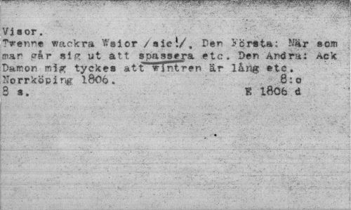 //// Visor. //// TVerme wackra Wsior /aiei/, Den S" q rata: När som man <?år aig ut att s passera etc. Den And ra i Ack Damon mig tyckes att vrintren är lång ate, Norrköping 1Ö06 . B:o //// S s. E l80fc d ////