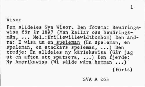 //// 1 //// Wisor //// Fem alldeles Nya Wisor. Den första: Bewärings-wisa för år 1897 (Man kallar oss bewärings-män, ... Mel.:Krillewillewidtbombom) Den andra: E wisa um en speleman (En speleman, en speleman, en stackars speleman, ...) Den tredje: En alldeles ny kärlekswisa (Går jag ut en afton att spatsera, ...) Den fjerde: Ny Amerikawisa (Wi sålde wåra hemman ...) //// (forts) //// SVA A 265 ////