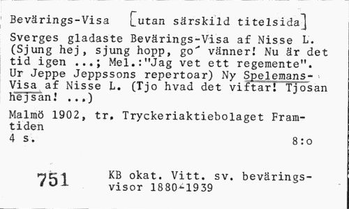//// Bevärings-Visa j^utan särskild titelsida^] //// Sverges gladaste Bevärings-Visa af Nisse L. (Sjung hej, sjung hopp, go"* vänner! Nu är det tid igen Mel.:"Jag vet ett regemente". //// Ur Jeppe Jeppssons repertoar) Ny Spelemans-Visa af Nisse L. (Tjo hvad det viftar! Tjosan he jsan I ..,) //// Malmö 1902, tr, Tryckeriaktiebolaget Framtiden //// 4 s. 8:0 //// KB okat. Vitt. sv. bevärings-visor 1880-1939 ////