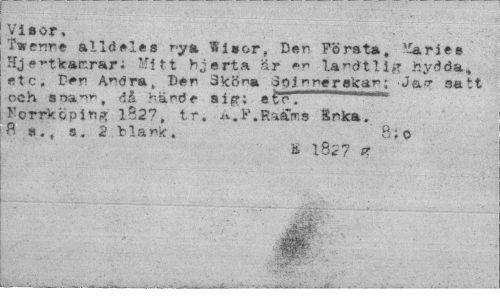 //// Viaor. //// Twerwe alldeles rya Wisor, Der Första, Maries Hjertkar.r&ri Mitt bjärta är er la^dtlig hydda, etc. Der Årdra, Ber 3köra 3oj n ner skar; Ja^ satt och soa^, då hårde aisr; et"r. — //// Forrköpirjg 1827, tr. A,F.Ratfms Srka. $ a ., s. 2 b la rk, B: o //// B 1827 pt //// jfr ////