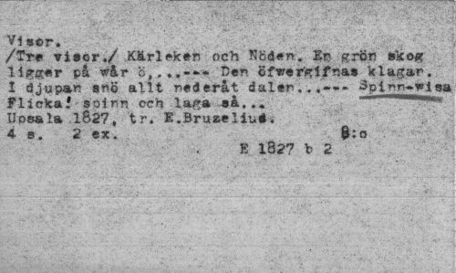 //// Vi ser, //// /Tre visor,/ Kärleken och Koden. En grön skog ligger på wår ö, Den öfw«rgifnas klagar. //// 1 djupan snö allt ned erat dalen,.,-»- 3plnn*wjsa //// Plickaf »oi rm .och laga^aå... . ¦ ..."V:—1, //// Dosa la 1Ö27, tr. E.Bruaeliui. 4 s. 2 ex. //// E 182? h 2 ////
