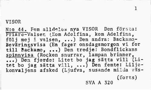 //// 1 //// VISOR //// N:o 44. Fem alldeles nya VISOR Den första: Friare-Valsen (Kom Adelfina, kom Adelfina, följ mej i valsen, ...) Den andra: Backamo,-Beväringsvisa (En fager onsdagsmorgon vi for till Backamo, ...) Den tredje: Bondflickans spinnvisa (Rocken snurrar, lampan brinner, //// Den fjerde: Litet bo jag sätta vill (Litet bo jag sätta vill, ...) Den femte: Liljekonvaljens afsked (Ljufva, susande milda väs- //// (forts) //// SVA A 320 ////