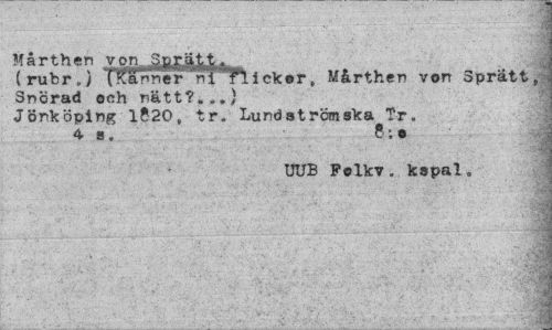 //// "Ii //// Mår then von t * //// (rubrj T^anner ni flicker, Mårthen von Spratt, //// Snörad ooh nätt?...) //// Jönköping 1520, tr. Lundströmska Tr. //// 4 s. ?: • • //// UUB Felkv. kspal. //// I //// ¦ jjm //// 'i. //// . . fJHH ////