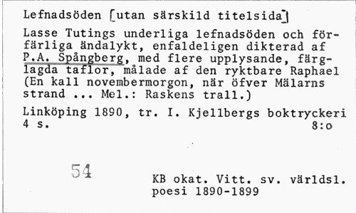 //// Lefnadsöden [utan särskild titelsida]] //// Lasse Tutings underliga lefnadsöden och förfärliga ändalykt, enfaldeligen dikterad af P.A. Spångberg, med flere upplysande, färglagda taflor, målade af den ryktbare Raphael (En kall novembermorgon, när öfver Mälarns strand ... Mel.: Raskens trall.) //// Linköping 1890, tr. I. Kjellbergs boktryckeri 4 s. 8:0 //// ~ .1 //// KB okat. Vitt. sv. världsl. poesi 1890-1899 ////