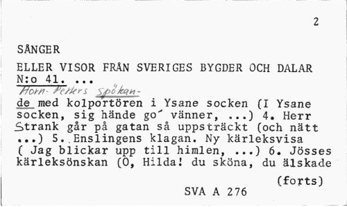 //// 2 //// SÅNGER //// ELLER VISOR FR4N SVERIGES BYGDER OCH DALAR N:o 41. ... //// ~77öFF~7Te/krs y o kg* - //// de_med kolportören i Ysane socken (I Ysane socken, sig hände go' vänner, ,..) 4. Herr Strank går på gatan så uppsträckt (och nätt ...) 5..Enslingens klagan. Ny kärleksvisa ( Jag blickar upp till himlen, ...) 6. Jösses kärleksönskan (0, Hilda I du sköna, du älskade //// (forts) //// SVA A 2 76 ////