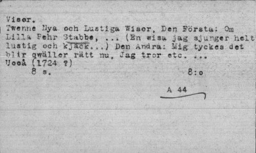 //// Visor, //// Turenné ilya och Lustiga Wisor, Den Första; Qai Lill£ Pehr Stabbe, ... (En wisa jag sjunger helt lustig och kjtfélc...) Pen Andra; Mig tyckes det blir gwäller rätt nu, Jag tror etc. ... Uooå (1724 ?) //// 8 s. 8:0 //// A ////