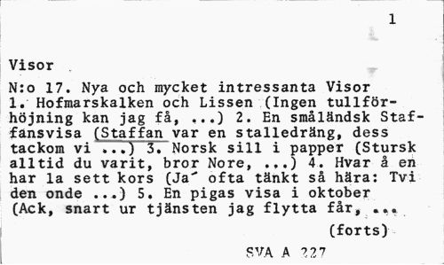 //// 1 //// Visor //// N:o 17. Nya och mycket intressanta Visor 1. Hofmarskalken och Lissen (Ingen tullförhöjning kan jag få, ,..) 2. En småländsk Staffansvisa (Staffan var en stalledräng, dess tackom vi »..) 3. Norsk sill i papper (Stursk alltid du varit, bror Nore, .,.) 4. Hvar å en har la sett kors (Ja" ofta tänkt så hära: Tvi den onde 5. En pigas visa i oktober //// (Ack, snart ur tjänsten jag flytta får, ... //// (forts) //// SVA A 7 2 7 ////