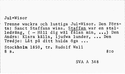 //// Jul=Wisor //// Trenne wackra och lustiga Jul=Wisor. Den Första: Sanct Staffans wisa. Staffan war en stalledräng, ( - Håll dig wäl falan min, ...) Den Andra: Klara källa, ljufwa lunder, ... Den Tredje: Låt på ditt hulda öga //// Stockholm 1850, tr. Rudolf Wall 8 S. 8:0 //// SVA A 34 8 ////