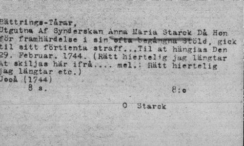 //// ¦¦¦ ¦ :¦¦ ¦ //// Bättrings-Tårar, //// Jtgutna Af Synderskan Anna Maria Starck Då Hon ?ör f ramhärd el se i sin* of-'t'« "»Tia "7?'61 d . gick :il sitt förtienta straff.,.til at hängias Den 29. Februar. 1744. (Rätt hiertelig jag längtar it skiljas här ifrå...'. mel.; Hatt hiertelig iag längtar etc.) Jeoå (1744) //// B a. 8: c //// 0 Starck ////