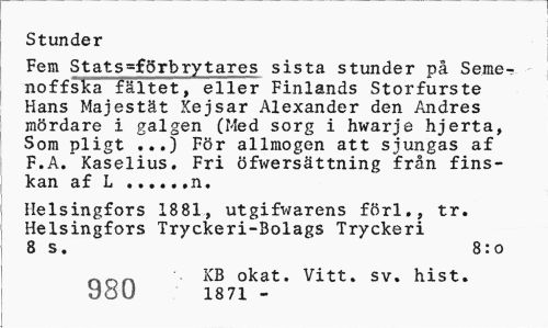 //// Stunder //// Fem Stats=förbrytares sista stunder på Seme-noffska fältet, eller Finlands Storfurste Hans Majestät Xejsar Alexander den Andres mördare i galgen (Med sorg i hwarje hjerta, Som pligt ...) För allmogen att sjungas af F.A." Kaselius. Fri öfwersättning från finskan af i...n. //// Helsingfors 1881, utgifwarens förl., tr. Helsingfors Tryckeri-Bolags Tryckeri 8 s. 8:0 //// KB okat. Vitt. sv. hist. yöU i87i - ////