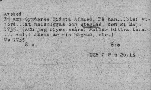 //// Av sk ed //// En arm Syndarss Sidsta Af.aSced , Då han.,,blef vt-förd... .at halshuggas och ateglas, den 21 Maj i 1735» (ACh jag hlyes swåra; fäller bittra tårar; ..» rafll.; JÄsus är min hägnad, etc.) //// Uo 1735 //// 8 s, 8 ; o //// UUB I P s 26;13 ////