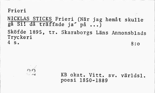 //// Frieri //// NICKLAS STICKS Frieri (När jag hemåt skulle gä Si i ""da träffade ja' på ...) //// Sköfde 1895, tr. Skaraborgs Läns Annonsblads Tryckeri //// 4 s. 8:0 //// KB okat. Vitt. sv. världsl. poesi 1850-1889 ////