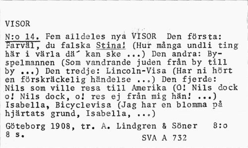 //// VISOR //// N:o 14. Fem alldeles nya VISOR Den första: Farväl, du falska Stina! (Hur många undli ting här i värla dä' kan ske ,..) Den andra: By-spelmannen (Som vandrande juden från by till by ..,) Den tredje: Lincoln-Visa (Har ni hört en förskräckelig händelse ..») Den fjerde: Nils som ville resa till Amerika (01 Nils dock ol Nils dock, oj res ej från mig hänJ ...) Isabella, Bicyclevisa (Jag har en blomma på hjärtats grund, Isabella, ..«,) //// Göteborg 1908, tr. A. Lindgren & Söner 8:o //// 8 s* SVA A 732 ////