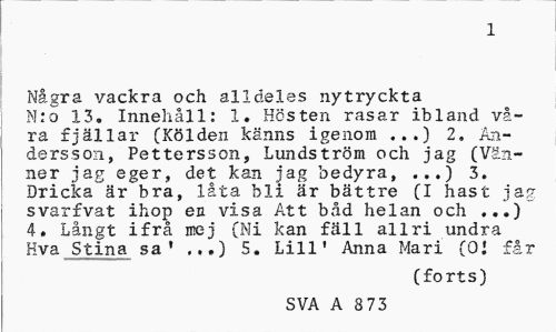 //// 1 //// Några vackra och alldeles nytryckta N:o 13, Innehåll: 1. Hösten rasar ibland våra fjällar (Kölden känns igenom ...) 2, Andersson, Pettersson, Lundström och jag (Vänner jag eger, det kan jag bedyra, 3. Dricka är bra, låta bli är bättre (I hast jag svarfvat ihop en visa Att båd helan och ...) 4. Långt ifrå mej (Ni kan fäll allri undra Hva Stina sa' ...) 5. Lill' Anna Mari (OJ får //// (forts) //// SVA A 8 73 ////