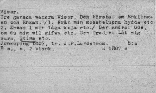 //// ^taor» //// Tre garska vackra Wisor, Den Första: om Knkiingen och Knican. /I. Från min mossbelupna hydda etc 2, JLnsaj» i min låga Koja etc./ Den Andra: Öde, om du »ig wil gifwa etc. Ben Tredje: Lat Sig »ara, Stina etc. //// J.önkopingT^O?, tr. w.P.Lundström. 8:0 //// 8 s., 5*, 2 blank. B 1S07 c ////