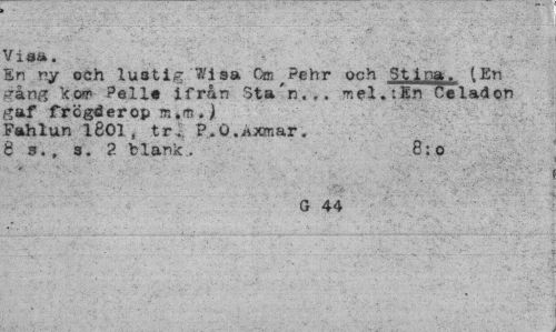 //// ¦o*' 7' *- • ; . ,- * //// Vi«Ä. //// En ny och lustig Wisa Cm #Pehr och Stina. I En gång kom Pelle ifrån Sta'n... mel. t En Celadon g af frcg<3erop //// Fahlun l801, tr. P.O.^xmar. g s., s. 2 blank.. 8:0 //// G 44 ////