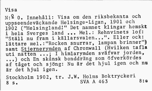 //// Visa //// N:= 0. Innehåll: Visa om den riksbekanta och uppseendeväckande Helsinge-Ligan, 1901 och 1902 ("HelsinglandI" Det namnet klingar hemskt i hela Sverges land ... Mel.: Rehnvinets lof: "Ställ nu fram i källarsvalen...". Eller ock: lättare mel.:"Rocken snurrar, lampan brinner"^ samt Stjernerymden af Chronwall (Hvilken tafla uti natten I himlarymden sväfvar jorden, //// .,.) och En skånsk bonddräng som öfverkördes af tåget och sjöng: Nu är det hjul igen och na är det hjul igen. //// Stockholm 1902, tr. J.W. Holms Boktryckeri 8 s. SVA A 46 3 8:e ////