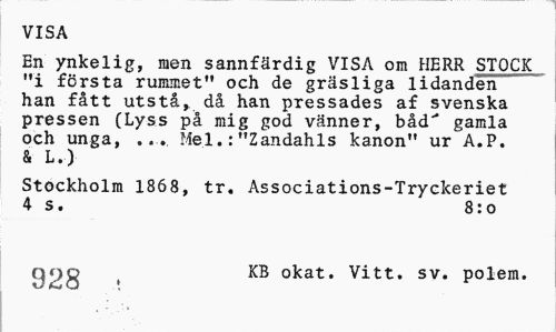 //// VISA //// En ynkelig, men sannfärdig VISA om HERR STOCK "i första rummet" och de gräsliga lidanden han fått utstå, då han pressades af svenska pressen (Lyss på mig god vänner, båd' gamla och unga, ... Mel.:"Zandahls kanon" ur A.P. & L.) //// Stockholm 1868, tr. Associations-Tryckeriet 4 s. 8:0 //// g9g ( KB okat. Vitt. sv. polem. ////