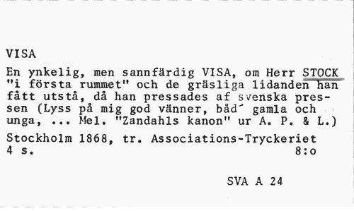 //// VISA //// En ynkelig, men sannfärdig VISA, om Herr STOCK "i första rummet" och de gräsliga lidanden han fått utstå, då han pressades af svenska pressen (Lyss på mig god vänner, båd~" gamla och unga, ... Mel. "Zandahls kanon" ur A. P. & L.) //// Stockholm 1868, tr. Associations-Tryckeriet 4 s. 8:0 //// SVA A 24 ////