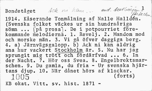//// Bondetåget Ack ^ ko** //// 1914. Kåserande Tonmålning af Nalle Halidén. (Svenska folket väckes ur sin hundraåriga sömn ... [på prosal. De i potpourriet förekommande melodierna. 1. Revelj. 2. Mandom mod och morske män. 3. Vi gå öfver daggiga berg. 4. a) Järnvägsgalopp, b) Ack ni kan aldrig ana hur vackert Stockholm är. 5. Nu har jag sprungit mig trött och fördärfvad ... 6. In der Nacht. 7. Hör oss Svea. 8. Engelbrektsmar-schen. 9. Du gamla, du fria - Ur svenska hjärtans djup. 10. När dånet hörs af klackar. //// 1005 (forts) //// KB okat. Vitt. sv. hist. 1871 - ////