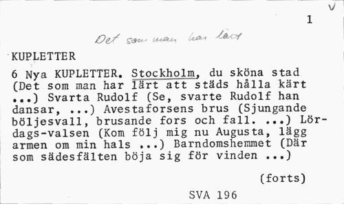//// v //// 1 //// Og,/ S&u.- U-oSu,^ //// KUPLETTER //// 6 Nya KUPLETTER. Stockholm, du sköna stad (Det som man har lärt att städs hålla kärt ...) Svarta Rudolf (Se, svarte Rudolf han dansar, ...) Avestaforsens brus (Sjungande böljesvall, brusande fors och fall. ...) Lördags-valsen (Kom följ mig nu Augusta, lägg armen om min hals ...) Barndomshemmet (Där som sädesfälten böja sig för vinden ...) //// (forts) //// SVA 196 ////